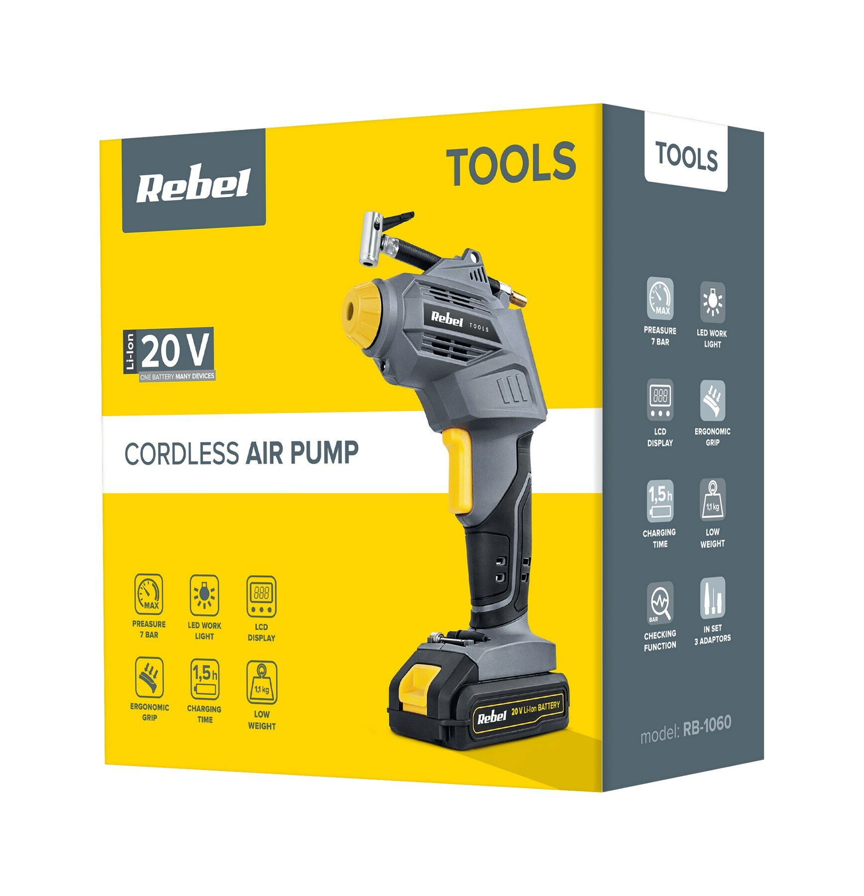 Schaf vandaag nog de RB-1060 accucompressor van Rebel aan en bespaar uzelf de moeite van handmatig lucht in uw banden pompen. Met de meegeleverde accessoires heeft u niet alleen de mogelijkheid om uw fiets- en autobanden op te pompen, maar ook om luchtbedden, ballen en zwembandjes voor de kinderen van lucht te voorzien. Als gewenst, schakelt de compressor automatisch uit zodra de beoogde druk is bereikt. De RB-1060 is voorzien van een LCD-display met achtergrondverlichting, waardoor u de druk altijd eenvoudig kunt aflezen.