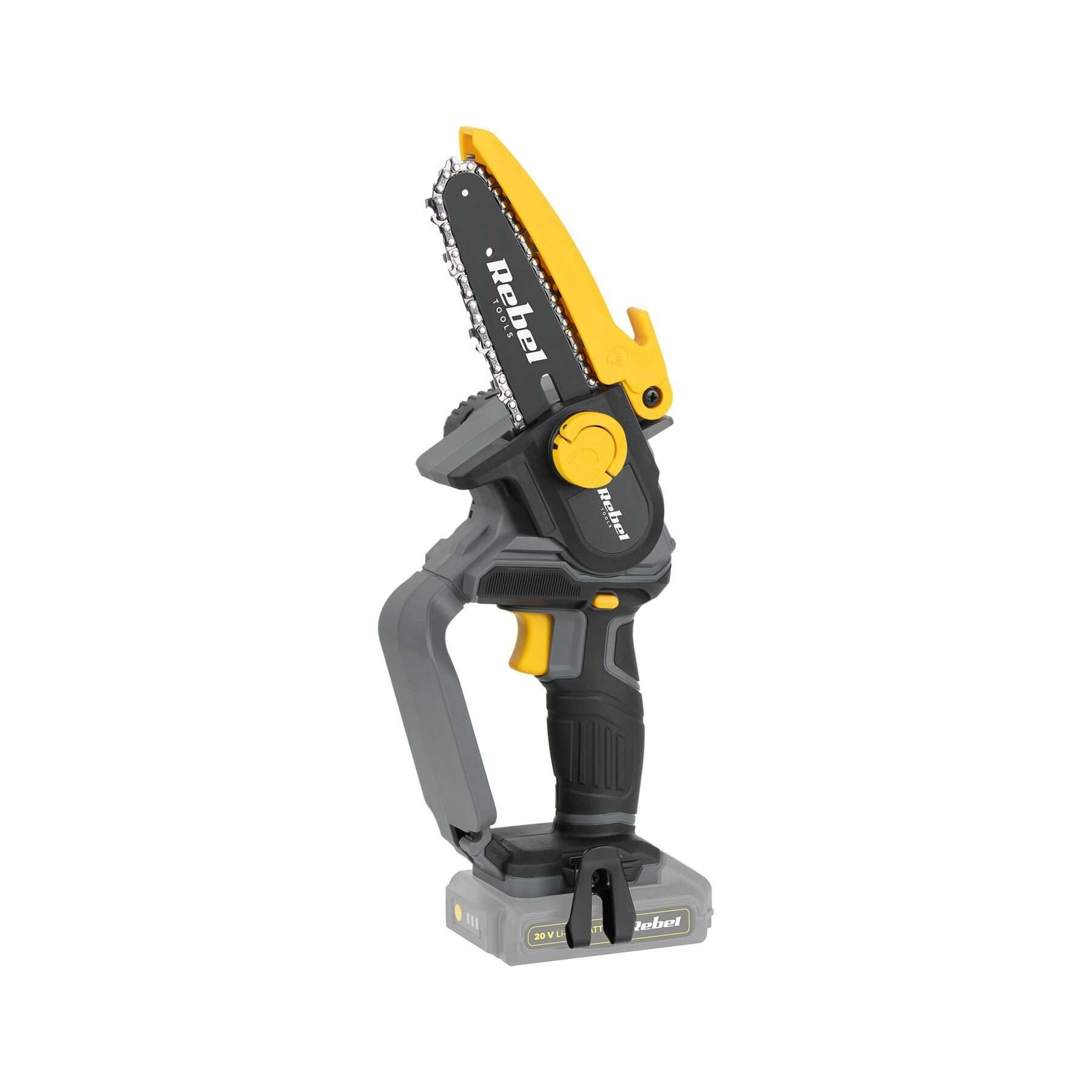 Laat je niet misleiden door de grootte! Deze compacte, draadloze kettingzaag van Rebel is uitgerust met verschillende veiligheidsvoorzieningen. Zo heeft hij een schakelaar met een vergrendelingsfunctie om onbedoelde activering van het gereedschap te voorkomen, en een beschermkap die, in combinatie met een ergonomische antislipgreep, veilig werken garandeert.