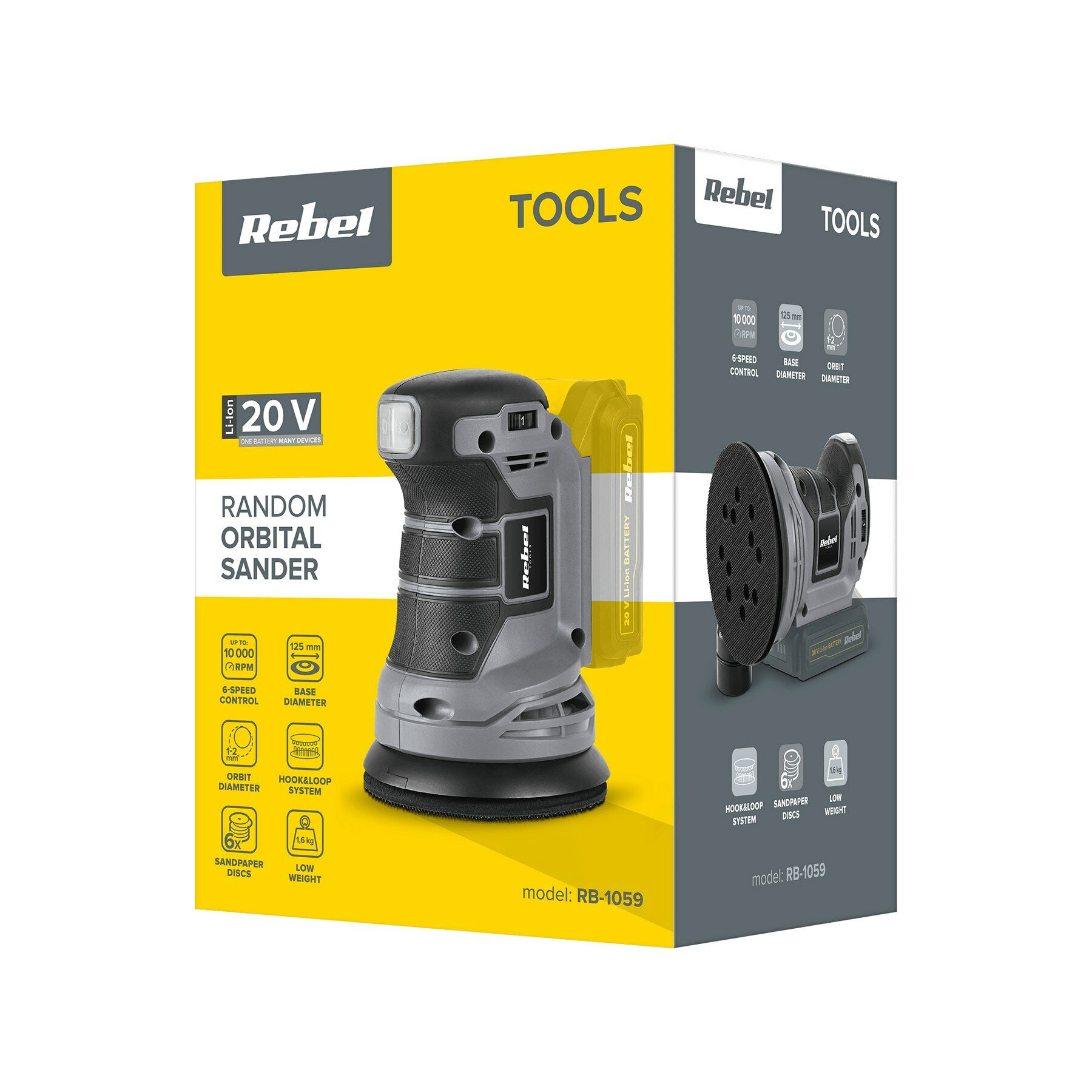 De excentrische accu-schuurmachine RB-1059 van Rebel gebruikt zowel slinger- als rotatiebeweging en maakt snel en perfect alle vlakken glad. Dankzij de geïntegreerde rubberen handgreep ligt de schuurmachine comfortabel in de hand. Doordat het apparaat draadloos te gebruiken is, kunt u de RB-1059 overal gebruiken.