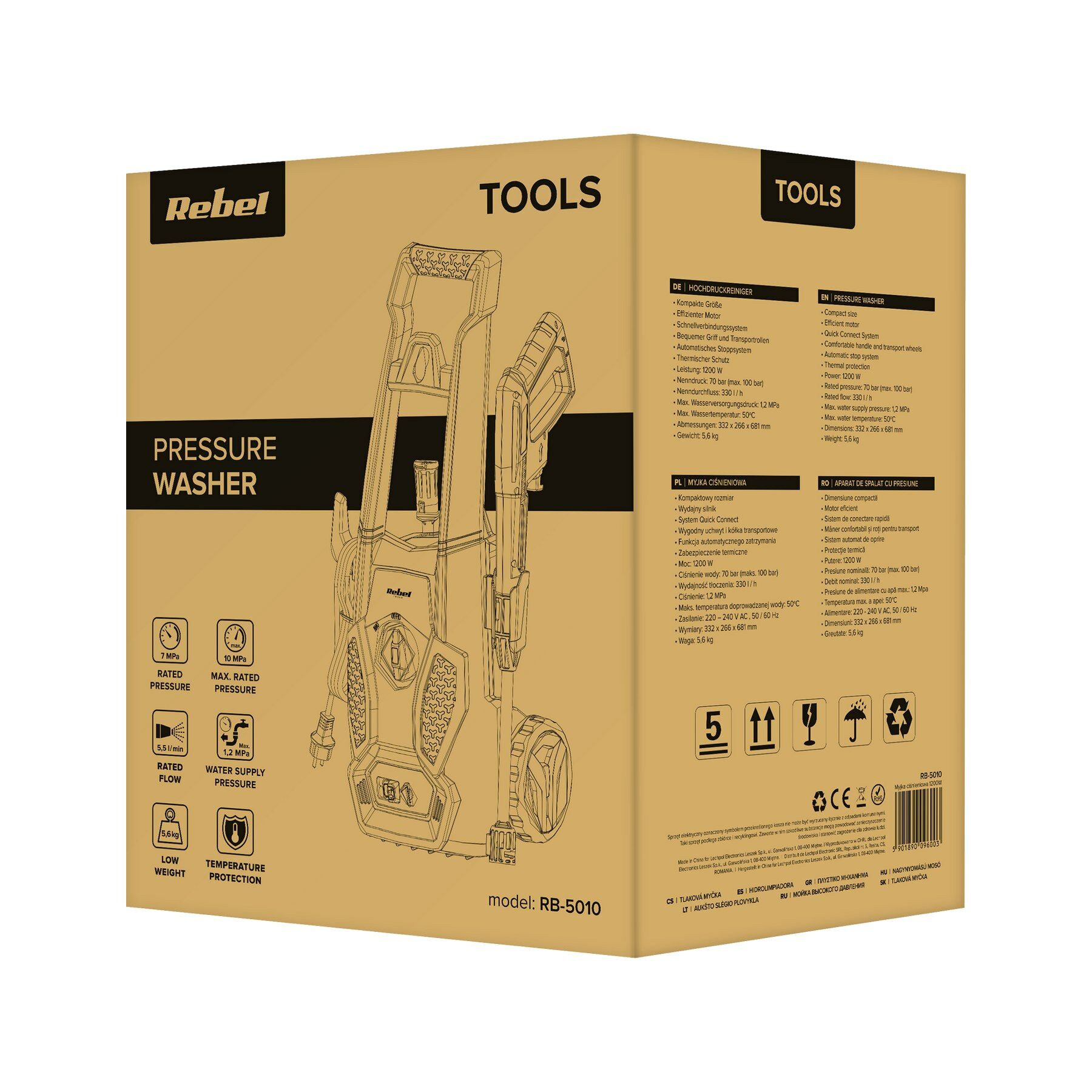 De RB-5010 hogedrukreiniger van Rebel is uitgerust met een 1.200 Watt motor. In combinatie met een efficiënte pomp die 330 liter water per uur pompt, is het apparaat in staat om een druk tot 100 bar te genereren. Hierdoor wordt hardnekkig vuil effectief van verschillende oppervlakken wordt verwijderd.