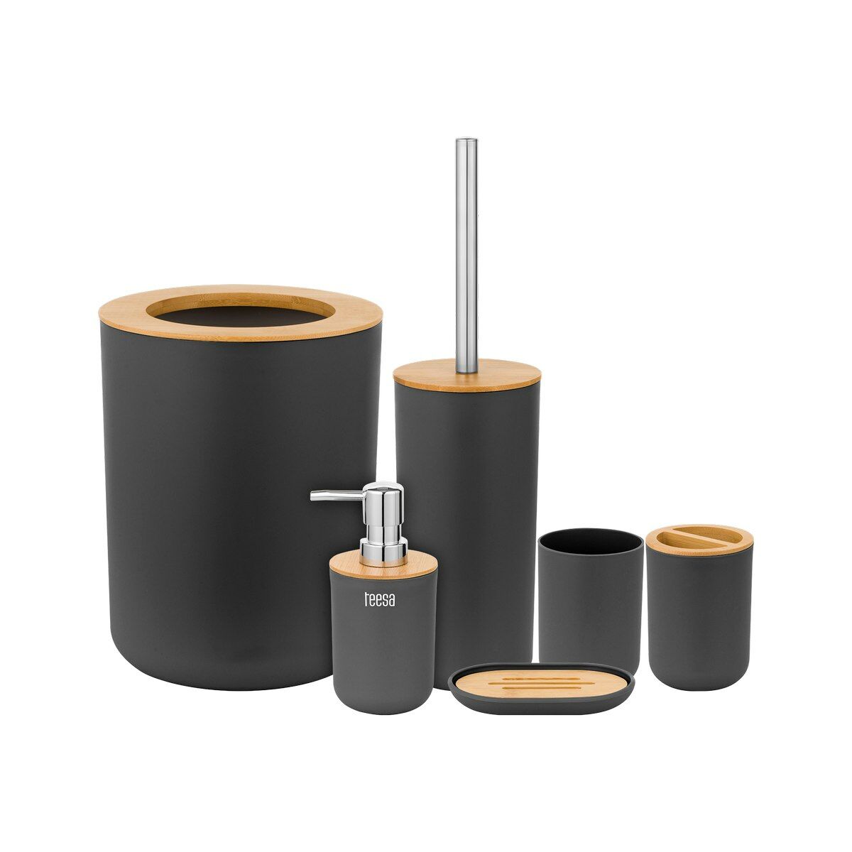 De set is leverbaar in grijs, wit en zwart en bestaat uit een zeepbakje, een zeepdispenser, een mok, een tandenborstelbeker, een toiletborstel en een prullenbak. Alle badkameraccessoires zijn gemaakt van hoogwaardig kunststof met de toevoeging van bamboehout.