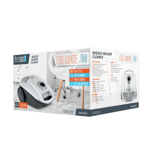 De TSA5020 ECO WHITE 700 stofzuiger van Teesa is een stille en krachtige stofzuiger die met zijn 700 watt vermogen moeiteloos al het vuil en stof opzuigt. Dit mooie exemplaar is zeer comfortabel, zowel in gebruik als opslag. Dankzij de rubberen wielen rijd de TSA5020 moeiteloos achter u aan. Mocht de 3 liter stofzuigerzak vol zijn, dan zal dit worden aangeduid door de handige indicator. De stofzuiger heeft drie zuigmonden: een ronde, een kierenzuigmond en een combinatiezuigmond, waarmee elk oppervlak stofvrij gemaakt kan worden. Deze compacte TSA5020 is voorzien van een HEPA-filter (H12) die nare uitblaaslucht voorkomt. Zo heeft u niet alleen een schone vloer, maar ook een frisse lucht in huis.