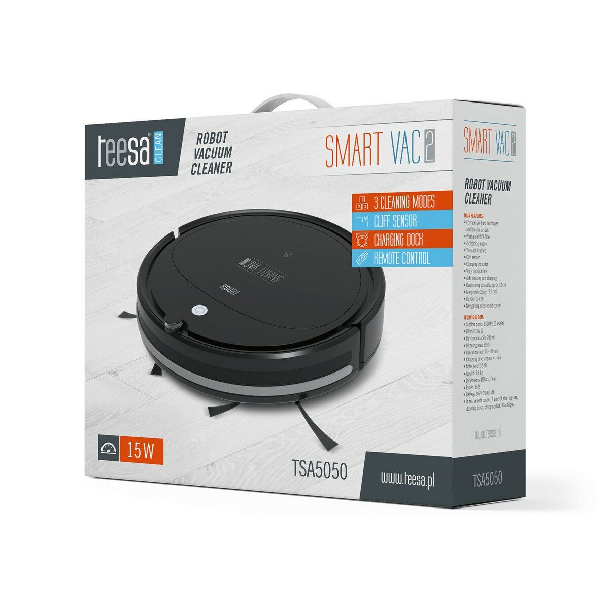 Hier is de TSA5050 SMART VAC 2 robotstofzuiger van Teesa, met drie reinigingsmodi. Met deze hulp in de huishouding houdt u tijd over voor leuke dingen. De TSA5050 is uitgerust met een automatisch reinigingssysteem, met een zuigsleuf in het midden van het apparaat. Dankzij de aanpasbare zuigkracht wordt uw vloer altijd perfect schoon. Nadat het werk is voltooid, of wanneer het batterijniveau aanzienlijk daalt, keert de stofzuiger vanzelf terug naar het oplaadstation. Het apparaat heeft een laag profiel, waardoor het gemakkelijk de vloer onder lage meubels kan reinigen. De TSA5050 is geschikt voor de meeste harde vloeren en laagpolige tapijten. Heeft u een allergieprobleem? Kies dan voor de TSA5050 met HEPA-filter, dat vuildeeltjes, virussen, bacteriën en andere microben opvangt. Geniet van schone vloeren en frisse lucht in huis. De robotstofzuiger wordt geleverd met een afstandsbediening waarmee u het schoonmaken kunt starten of pauzeren, de richting kunt aangeven, de zuigkracht kunt aanpassen en het apparaat naar het docking station kunt begeleiden.