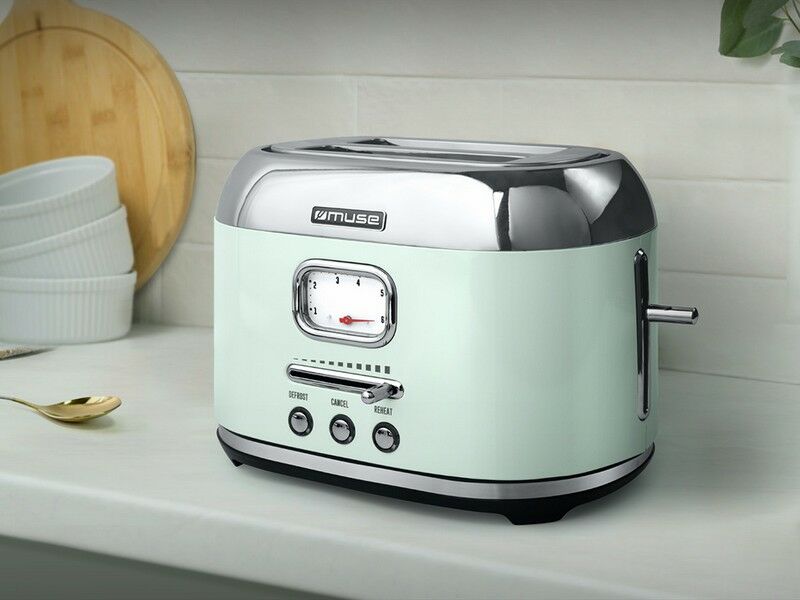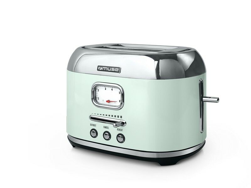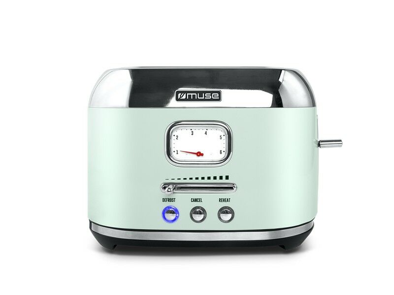 Met de fraai vormgegeven MS-120AG broodrooster van Muse zet u heerlijke toast op tafel. Deze in retrostijl uitgevoerde broodrooster is geschikt voor twee toasts. De MS-120AG is uitgerust met zes roosterstanden, die worden weergegeven op het analoge display. Ook bevat het apparaat een stopknop, waarmee u het roosteren al voor de eindtijd kunt stoppen. Naast het roosteren, kunt u ook brood ontdooien. Daarnaast vergemakkelijkt de uittrekbare kruimellade het schoonmaken. Voeg een retro sfeer aan uw keuken toe en maak uw ontbijtset compleet met de bijpassende waterkoker (MS-020VB) en koffiezetapparaat (MS-220 serie). Specificaties • Analoog display • Broodrooster voor twee toasts • Zes standen; variabele bruiningsregeling met stop-, ontdooi- en opwarmfunctie • Automatisch centreren • Stopknop • Verlichte knoppen • Kruimellade • Opbergsysteem voor snoer • Antislipvoetjes • Vermogen: 1.000 Watt • Behuizing: 304 roestvrijstaal • Netvoeding: 220-240 V / 50-60 Hz • Afmeting product: 18,5 x 27,5 x 18,3 cm (BxDxH) • Gewicht incl. verpakking: 1,68 kg • EAN-code: 3700460209612