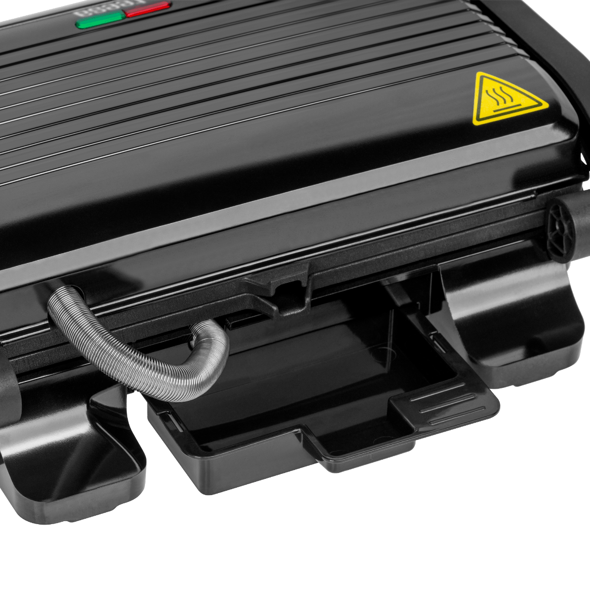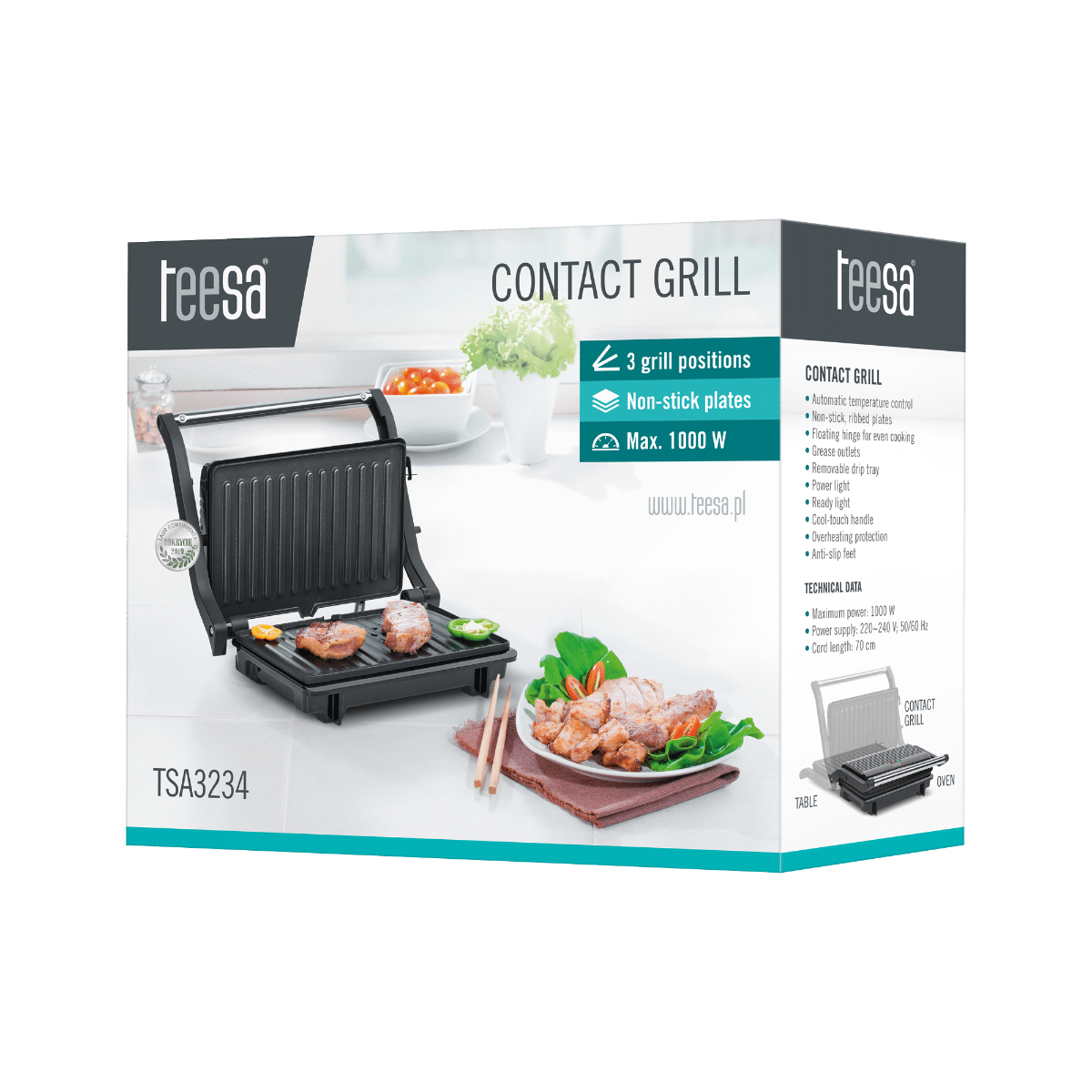 Dankzij de antiaanbaklaag kunt u vlees bereiden met een minimale hoeveelheid vet, het overtollige vet wordt namelijk afgevoerd in de lekbak en komt niet op uw bord terecht. Veilig gebruik van de Teesa grill wordt gegarandeerd door antislipvoetjes, een koel handvat en de bescherming tegen oververhitting.