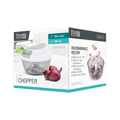 Wilt u het uzelf in de keuken nog eenvoudiger maken? Stop met het verspillen van tijd en ruimte! Met de TSA0197 handmatige hakmolen met een inhoud van 400 ml versnippert u met behulp van drie scherpe messen met gemak uien, wortelen, noten en/of kruiden. Het apparaat is snoerloos en wordt in beweging gezet door het trekkoord. De kom van de hakmolen is gemaakt van transparant BPA-vrij materiaal, zodat u goed kunt zien of de groente op de gewenste grootte gesneden is. Bovendien is de TSA0197 voorzien van antislipvoetjes aan de onderzijde. Dit zorgt voor veilig en comfortabel gebruik. De kom is afsluitbaar, zodat u de gesneden ingrediënten met kom en al kunt bewaren in de koeling.