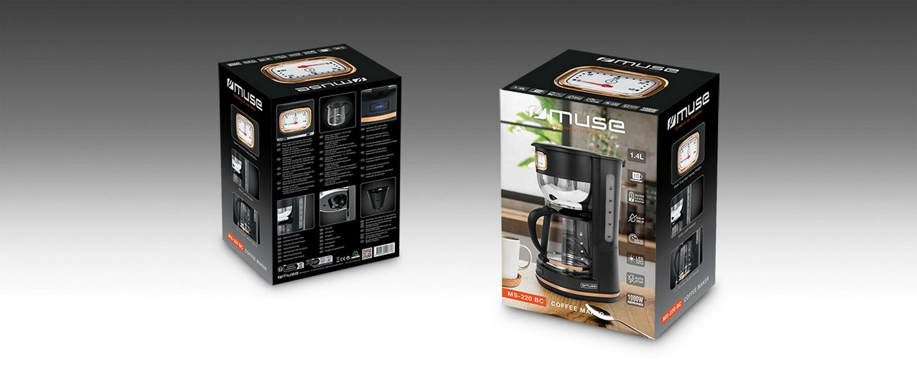 Met dit stijlvolle koffiezetapparaat MS-220BC van Muse zet u de lekkerste filterkoffie. De MS-220BC heeft een inhoud van 1,4 liter, goed voor 10 kopjes koffie. Dit in retrostijl uitgevoerde koffiezetapparaat combineert moderne techniek met vintage design. De MS-220BC is uitgevoerd met analoge warmhoudindicatie (tot wel 40 minuten). Ook aan de veiligheid is gedacht; de waterkoker schakelt automatisch uit indien er geen water in het apparaat zit en als het water kookt.