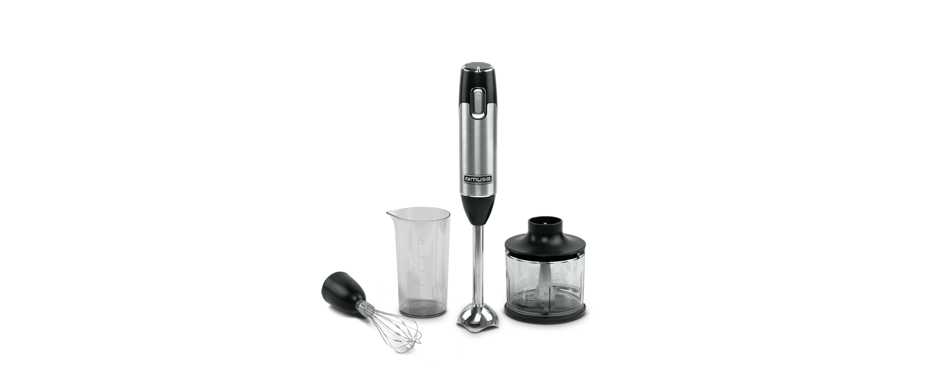 Een onmisbaar apparaat in de keuken is de Staafmixer. De Muse MS-05 HB is bijzonder handig in gebruik, want het bevat naast de klassieke mengstaaf ook een hakmolen en een garde. Hiermee kun je niet alleen heerlijke cocktails en soepen bereiden, maar ook groenten snijden en slagroom maken. Kortom een must-have in elke keuken !! Specificaties • Verwijderbare roestvrijstalen blenderas • Roestvrijstalen mes • Variabele snelheid voor opkloppen en mengen • Beker met schenktuit, inhoud 550 ml • Hakkom, met inhoud van 600 ml • Klopper / garde opzetstuk • Vermogen: 600 Watt • Netvoeding: 220-240 V / 50-60 Hz • Afmeting product: blender: 5,5 x 5,5 x 39,2 cm (BxDxH) Hakkom: 12,6 x 14,2 x 14,2 cm (BxDxH) beker: 8,7 x 9,8 x 15,3 cm (BxDxH) klopper / garde 6,8 x 6,8 x 27,8 cm (BxDxH) • Gewicht incl. verpakking: 1,64 kg • EAN-code: 3700460209193