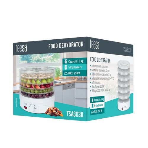Voor een gezonde leefstijl! De TSA3030 van Teesa is een klassieke groente- en fruitdroger met maar liefst vijf lagen. De TSA3030 is uitermate geschikt voor het drogen van onder andere fruit, groente, thee, kruiden, vlees en vis. U kunt eenvoudig stapsgewijs de temperatuur instellen met de draaiknop. Automatische ventilatoren circuleren de warme lucht door deze voedseldroger en garanderen daarmee een gelijkmatig drogingsproces. Het voordeel van gedroogd voedsel is dat vitamines en mineralen behouden blijven. De voedseldroger heeft een behuizing van hoge kwaliteit wit en transparant ABS-kunststof en beschikt over antislipvoetjes voor stabiliteit. Reiniging is eenvoudig, omdat de gehele voedseldroger demonteerbaar is.