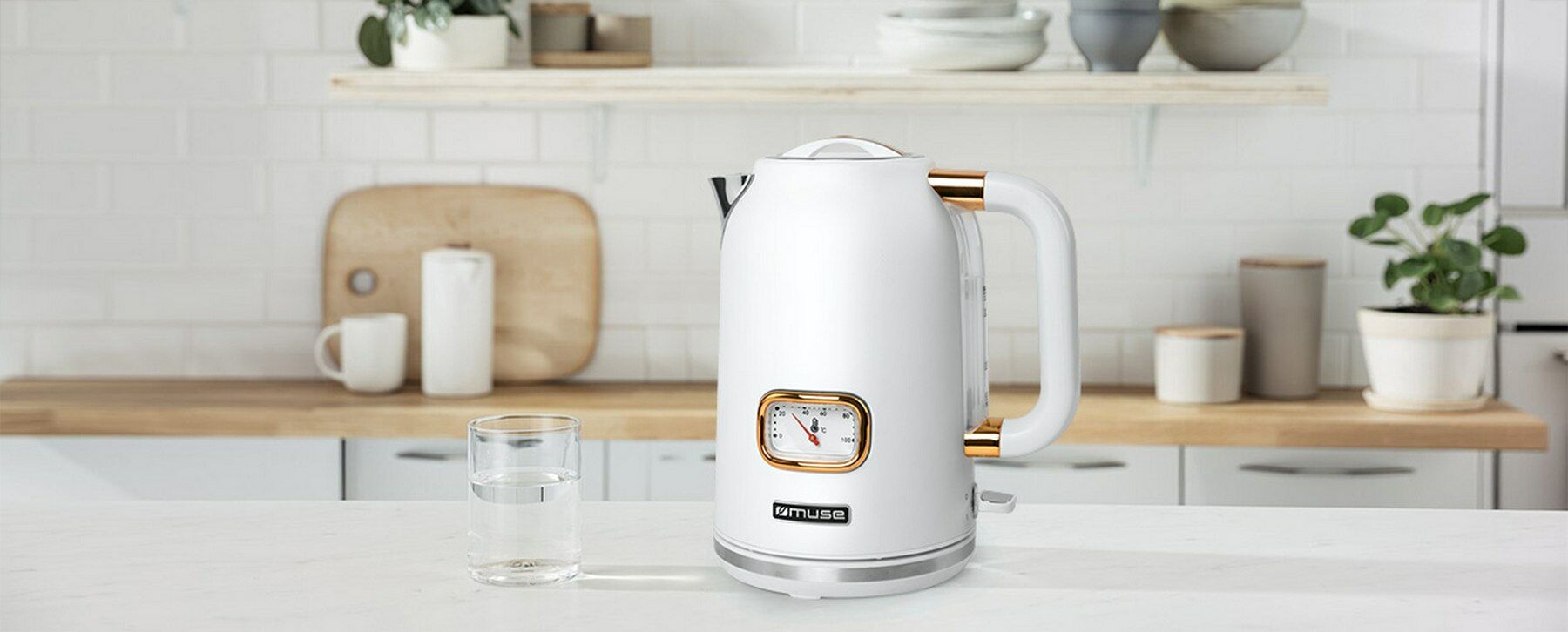 De stijlvolle MS-030W waterkoker van Muse heeft een inhoud van 1,7 liter. Deze in retrostijl uitgevoerde waterkoker combineert moderne techniek met vintage design. De MS-030W is uitgevoerd met waterniveau-aanduiding en een analoge temperatuurmeter. Ook aan de veiligheid is gedacht; de waterkoker schakelt automatisch uit indien er geen water in het apparaat zit en als het water kookt.