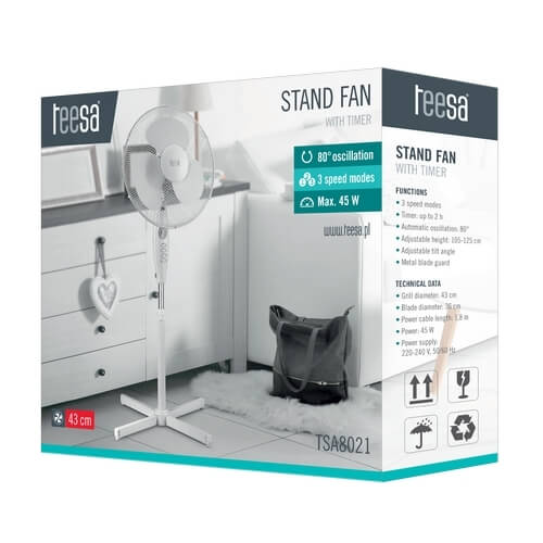 Houd het hoofd koel met de TSA8021 statiefventilator van Teesa! Als u één van de drie snelheidsstanden kiest, bent u er zeker van dat u de gewenste verkoeling krijgt op de warmere dagen. De ventilator verkoelt elke ruimte, heeft een instelbare hoogte en de mogelijkheid om de hellingshoek aan te passen. Van de drie standen is er ook een slaapstand, waarbij het apparaat de luchtstroom geleidelijk vermindert. U kunt de TSA8021 automatisch laten uitschakelen op het gewenste moment d.m.v. de timer.