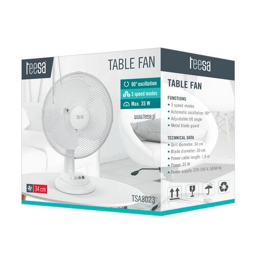 De TSA8023 tafelventilator van Teesa is perfect voor de warmere dagen op kantoor of in huis! Met één van de drie standen krijgt u altijd de verkoeling die u wenst. De ventilator verkoelt elke ruimte en heeft de mogelijkheid om de hellingshoek aan te passen. Ook is bij deze fan gedacht aan veiligheid, dankzij het metalen rooster. De TSA8023 is dankzij het compacte formaat uitermate geschikt om op een bureau of tafel te plaatsen en heeft een stille werking. Ideaal dus om te gebruiken tijdens het werk op de warmere dagen.
