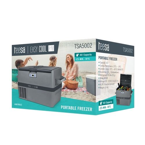 Deze krachtpatser, de TSA5002 draagbare koelbox van Teesa, is een superhandige draagbare koel- en vrieskast. Met zijn inhoud van wel 40 liter koelt de TSA5002 voedingsmiddelen tot wel -18°C. De binnenkant van de vriezer bestaat uit twee compartimenten, waarvan één met mand. Deze krachtpatser neemt weinig ruimte in beslag en is handig om mee te nemen, omdat het apparaat eenvoudig kan worden aangesloten op uw stopcontact of op de 12/24 volt sigarettenaansteker van de auto. Dus of u nu onderweg bent of even extra vriesruimte nodig hebt, met de TSA 5002 van Teesa heeft u de perfecte oplossing om uw dranken koel te houden.
