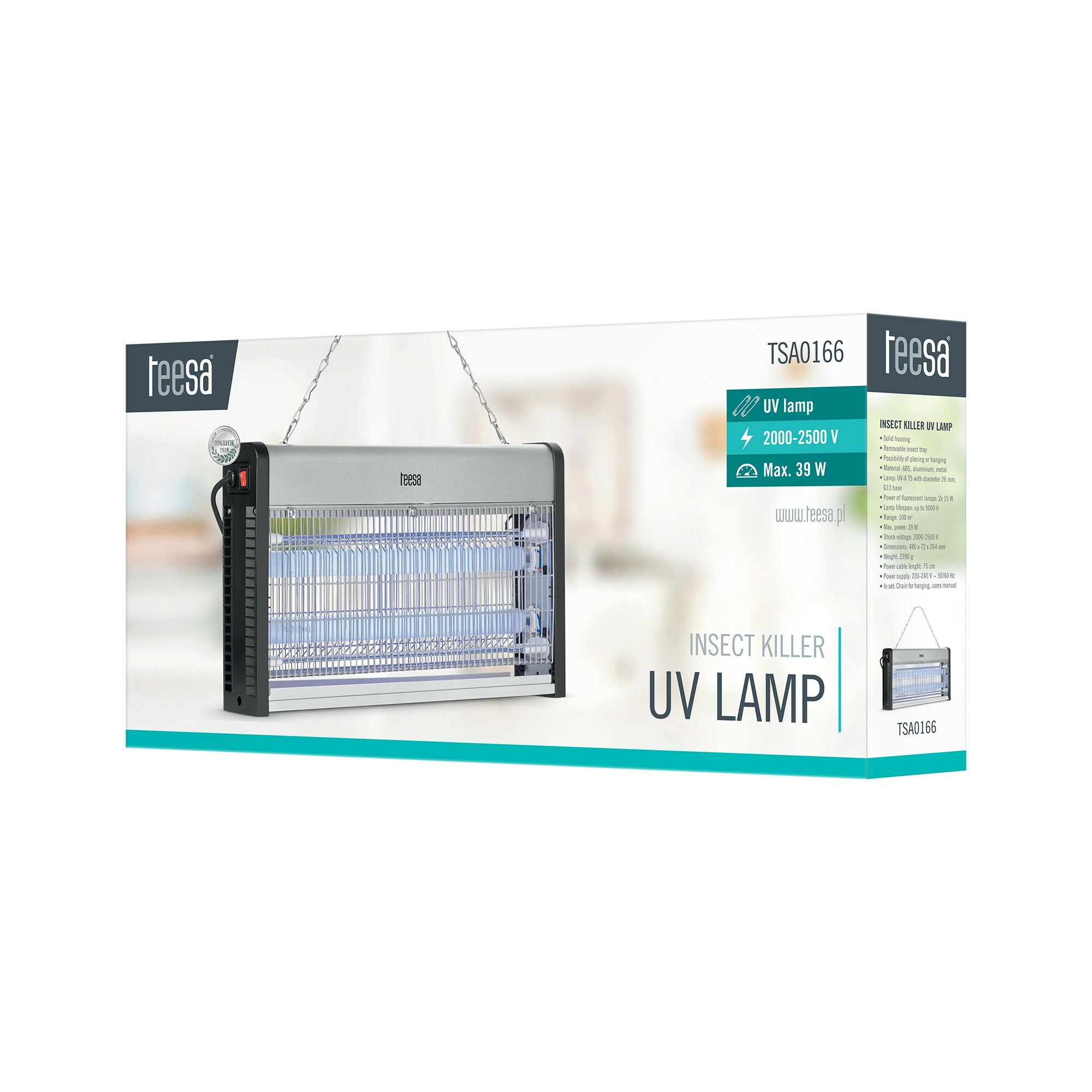 Heeft u vaak last van vliegen en muggen thuis, in uw werkplaats, magazijn of op uw balkon of terras? Dan is de TSA0166 insectenlamp een goede oplossing. Het apparaat is zeer effectief en gaat zelfs de kleinste insecten niet uit de weg. Dit model is ontworpen voor ruimtes met een groot oppervlak. U kunt deze insectenvanger eenvoudig ophangen met de meegeleverde metalen ketting of neerzetten, waar u maar wilt. Het apparaat maakt gebruik van hoogwaardige fluorescentielampen die lang meegaan. Met de TSA0166 insectenlamp van Teesa zult u ongetwijfeld minder last hebben van insecten.