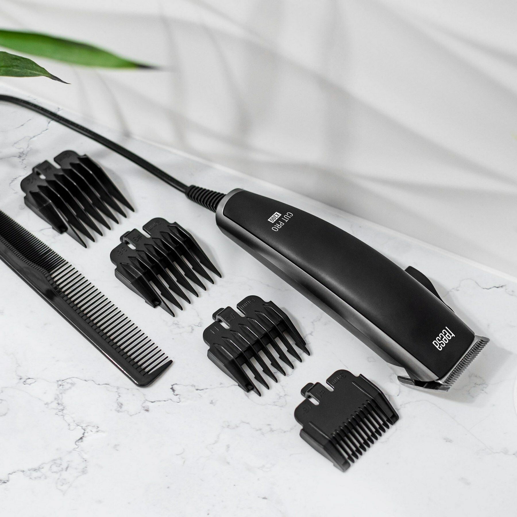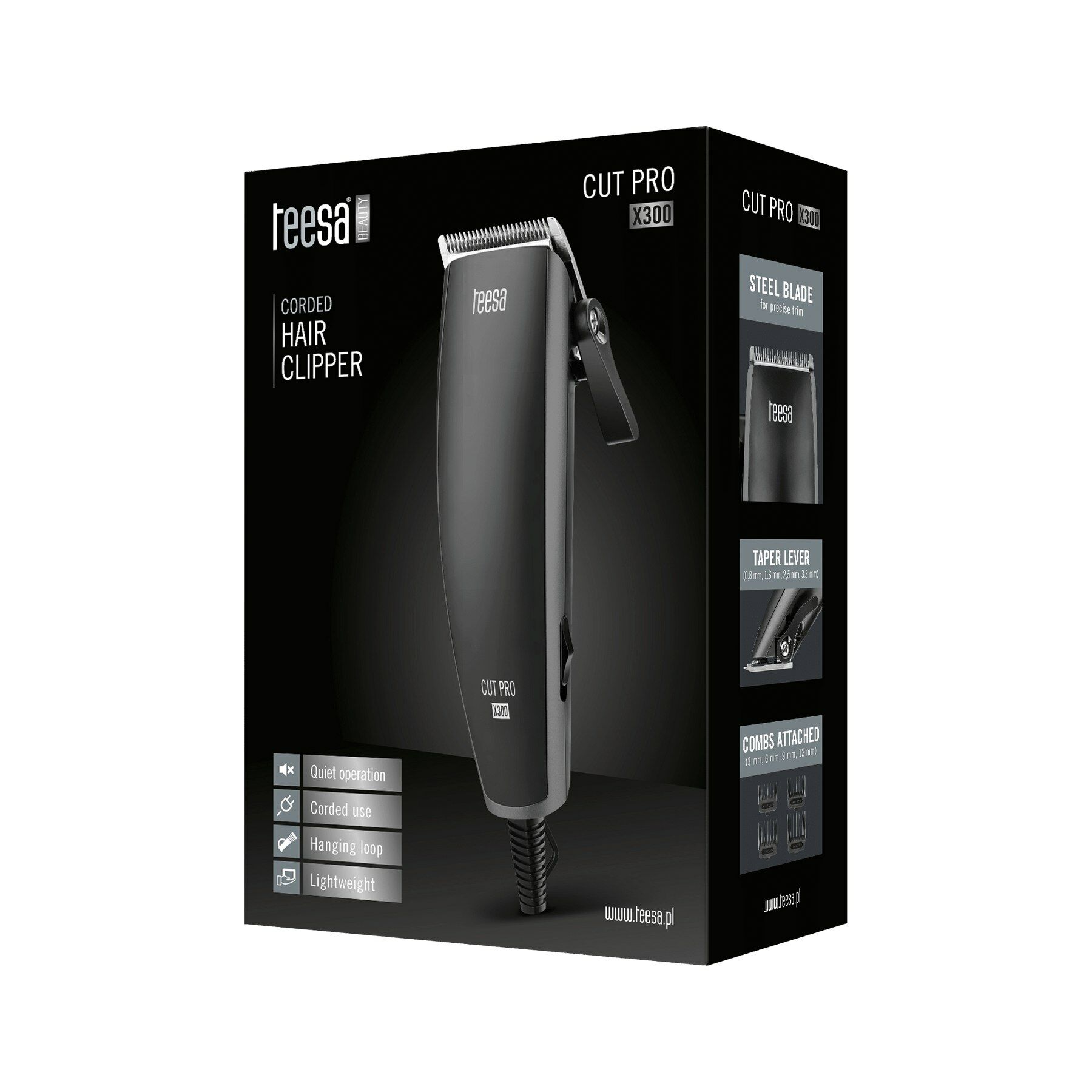 Een tondeuse moet voldoende kracht hebben en klaar zijn voor gebruik wanneer u deze nodig hebt. Daarom is de Teesa CUT PRO X300 - een model met snoer (1,8 m) en een vermogen van 7 Watt - de perfecte keuze.