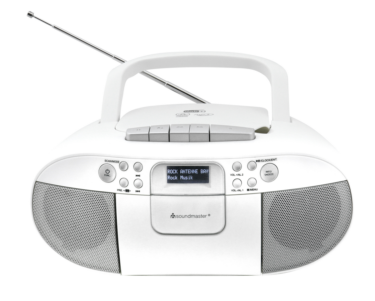 De Soundmaster SCD5100WE heeft een elegante witte kleur en is geschikt voor gebruik zowel binnen- als buitenshuis. Dit apparaat beschikt over een comfortabele handgreep, een stereo FM-radio, CD-, en cassettespeler. Verder is de Soundmaster SCD5100WE uitgerust met twee luidsprekers, een AUX-In- en een hoofdtelefoonaansluiting. De boombox werkt op stroom en op batterijen zodat deze overal mee naartoe genomen kan worden. Specificaties • FM-radio • CD-speler geschikt voor CD / CD-R / CD-RW • Programeer- en herhaalfunctie • Cassettedeck • 3,5 mm AUX-In-aansluiting • 3,5 mm Hoofdtelefoonaansluiting • Netvoeding: AC 230 V / 50 Hz • Batterij 6 x 1,5 V / LR 14 (niet meegeleverd) • Afmeting product: 29,5 x 21,5 x 13,3 cm (BxDxH) • Gewicht incl. verpakking: 2,0 kg • EAN-code: 4005425012580
