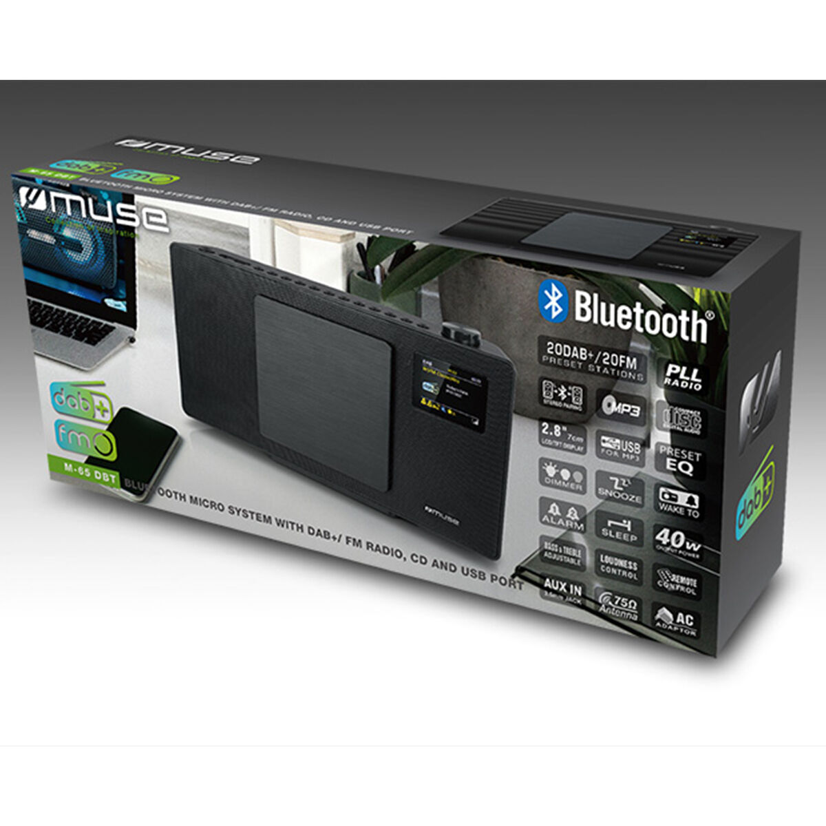 Dit fraaie, veelzijdige M-65DBT microsysteem van Muse zorgt voor een prachtig geluid en heeft een strak design. Het is een echte alleskunner. Dit microsysteem speelt namelijk muziek af via bluetooth, DAB+/FM-radio, CD, USB of een extern apparaat via de AUX-in aansluiting. Verder is deze topper van Muse uitgerust met een multifunctioneel LCD-kleurendisplay en een klok met alarmfunctie. Het apparaat is gemakkelijk te bedienen met de meegeleverde afstandsbediening. Of u de Muse M-65DBT nu op een kast zet of aan de muur bevestigd, u zult gegarandeerd heel veel luisterplezier gaan beleven als u deze parel in huis haalt.