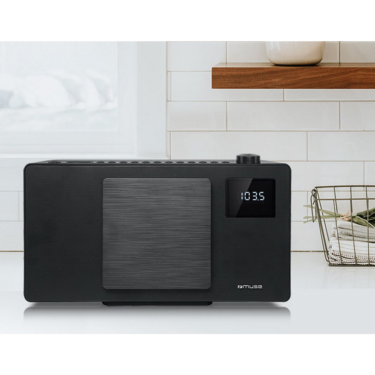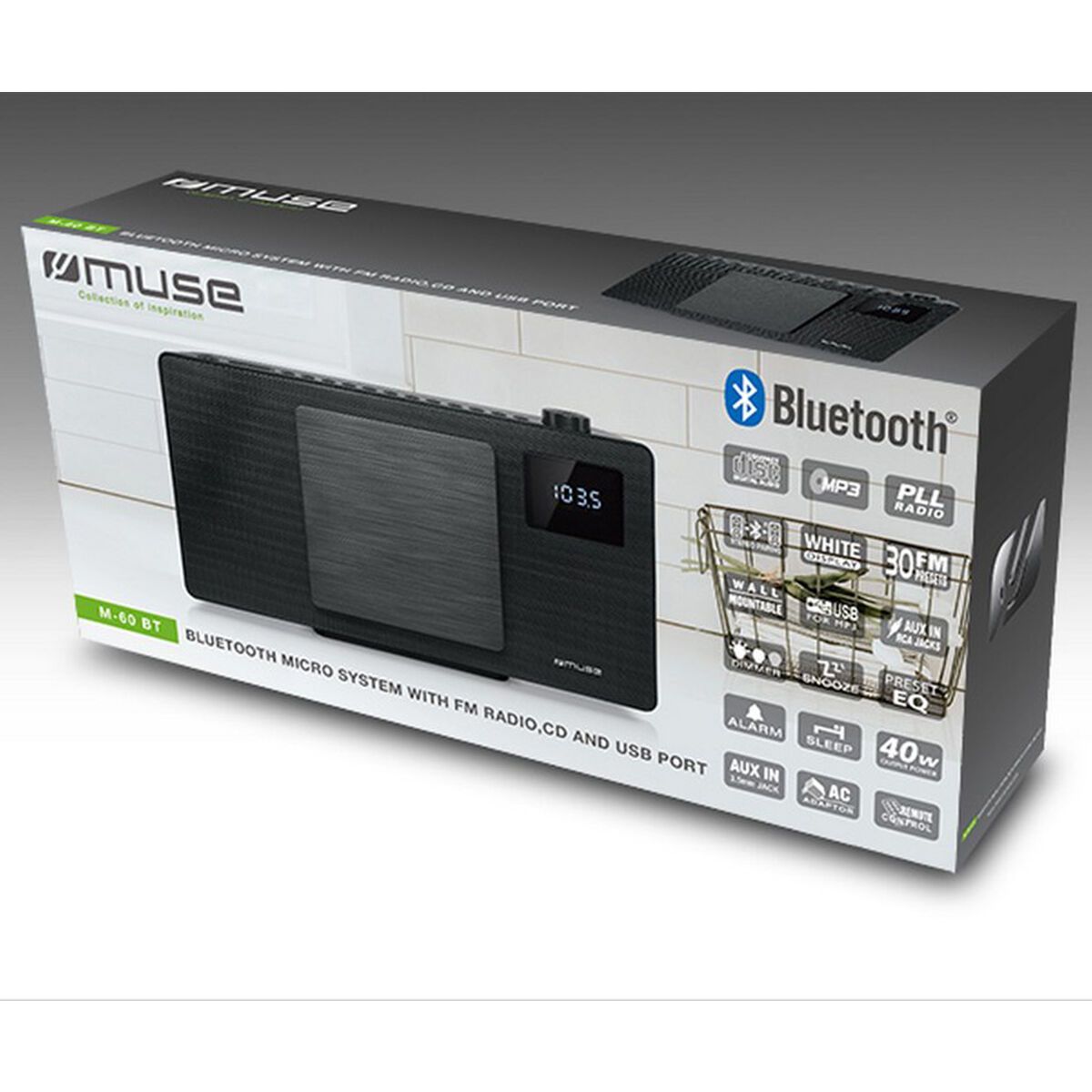 Dit fraaie veelzijdige M-60BT microsysteem van Muse zorgt voor een prachtig geluid en heeft een strak design. Het systeem is aan de muur te bevestigen en rechtop te plaatsen. Het betreft een echte alleskunner. Dit microsysteem speelt namelijk muziek af via bluetooth, FM-radio, CD, USB of een extern apparaat via de AUX-In-aansluiting. Deze topper is verder uitgerust met een dimbaar multifunctioneel LED-display en een klok met alarmfunctie. Het apparaat is gemakkelijk te bedienen met de meegeleverde afstandsbediening. Met de Muse M-60BT haalt u een echte parel in huis en zult u veel luisterplezier beleven.
