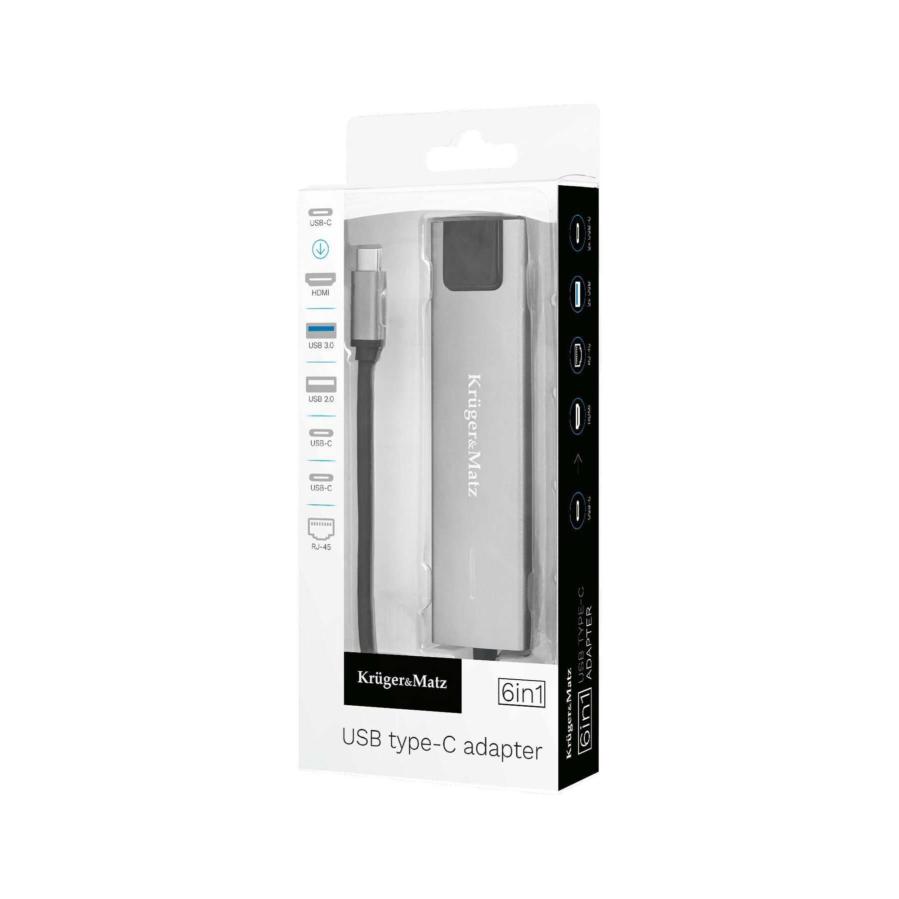 Met de Kruger & Matz KM0391 USB-adapter haalt u nog meer uit uw laptop of tablet. Voor deze 6-in-1 adapter heeft u alleen een USB Type-C-poort nodig! De adapter heeft twee USB-poorten voor het aansluiten van bijvoorbeeld uw muis of toetsenbord en 4K HDMI-uitgang. Hiermee sluit uw eenvoudig een extra monitor of tv aan en geniet u van beelden van de hoogste kwaliteit. De adapter is daarnaast uitgerust met twee USB Type-C-poorten, met de ene poort laadt u snel uw smartphone of voorziet u uw monitor van stroom. Last but not least verbindt u uw laptop met het netwerk middels de RJ-45-poort, die snel en betrouwbaar gegevens verstuurd met tot wel 100 Mbps.