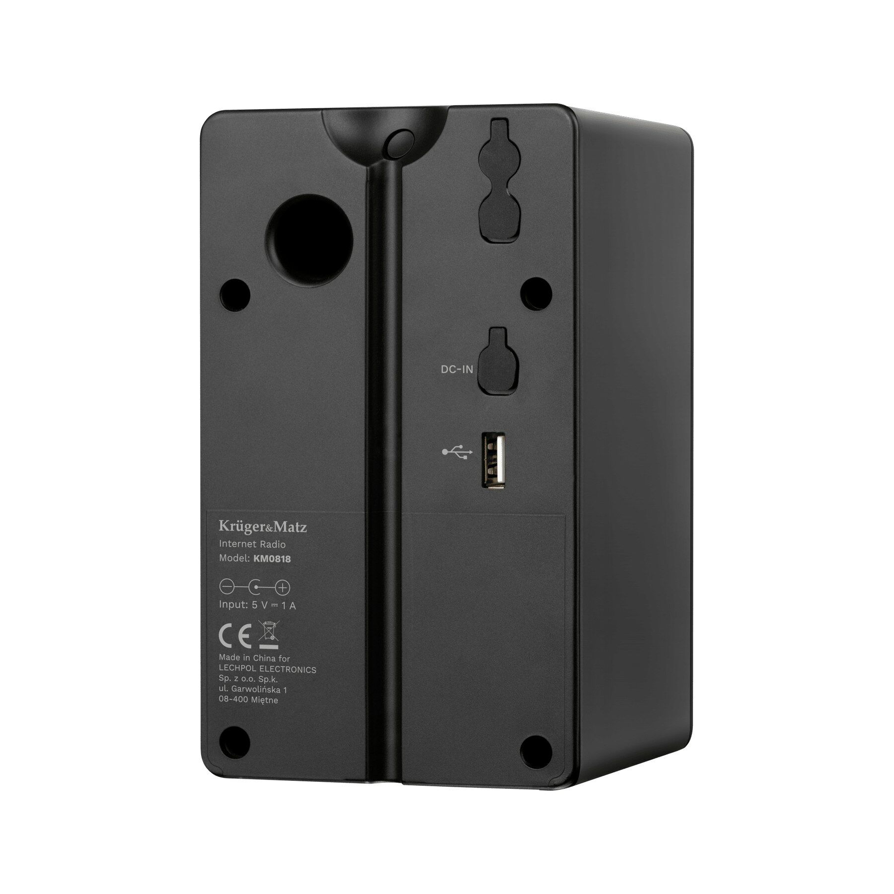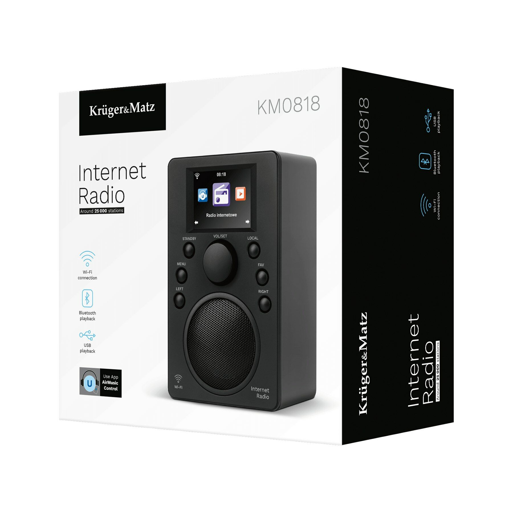De Krüger&Matz KM0818 is een compacte en meer dan complete radio. Deze internetradio is tevens uitgerust met DAB+, bluetooth en een USB-aansluiting. Sluit de radio aan op uw WiFi-netwerk en geniet van meer dan 25.000 radiostations. De KM0818 van Krüger&Matz is vanaf uw smartphone te bedienen met de AirMusic Control-app. De KM0818 biedt de mogelijkheid om muziek te streamen van uw mobiele apparaten of muziek af te spelen via de USB-aansluiting, waarmee u ook uw mobiele apparaten kunt opladen. En of het allemaal nog niet genoeg is, beschikt de KM0818 over een ingebouwde klok, timer, alarmfunctie en weerstation. Kortom: een complete alleskunner voor thuis of op kantoor.