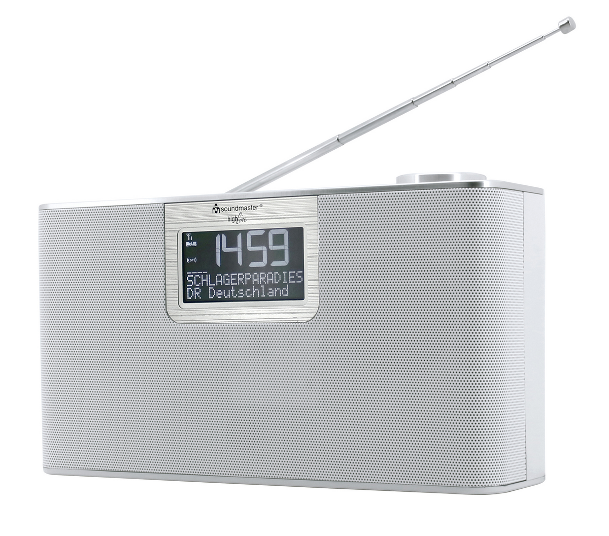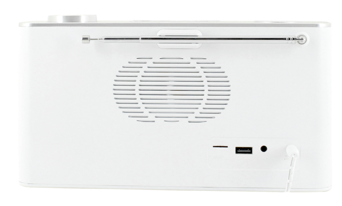Met de Soundmaster DAB700WE radio is het mogelijk om zowel naar DAB+ als FM-radiostations te luisteren. Kortom: de mogelijkheid tot ontvangst van heel veel radiozenders, dus uw favoriete muziek zult u zeker vinden. Ook is deze Soundmaster radio voorzien van bluetooth, waardoor u ook uw favoriete muziek vanaf uw tablet of smartphone kunt afspelen. En om het helemaal compleet te maken, is er ook een USB- en micro-SD-kaartslot op het apparaat aanwezig. De DAB700WE heeft een 2,9” LCD-scherm waar alle informatie duidelijk van af te lezen is. Tevens beschikt het apparaat over een wekkerfunctie met dubbel alarm. Heel veel mogelijkheden dus voor zo’n compact apparaat. Specificaties • DAB+/FM-radio met 30 voorkeuzezenders • Drie voorkeurstoetsen • Bluetooth connectiviteit • Voorgeprogrammeerde equalizer • Dimbaar 2,9” LCD-display (drie standen) • AUX-In-, USB en micro-SD-MP3-aansluiting • Handsfree-functie • Klok en wekker met dubbel alarm, sleep- en snoozefunctie • Uitgangsvermogen: 2x 6 Watt (RMS) • AC/DC adapter 8,5V / 1,5 A • Netvoeding: 230 V / 50 Hz • Batterijen: DC 7.5 V, 5x LR14/C (niet meegeleverd) • Afmeting product: 24,0 x 8,0 x 14,0 cm (BxDxH) • Gewicht incl. verpakking: 1,68 kg • EAN-code: 4005425009931