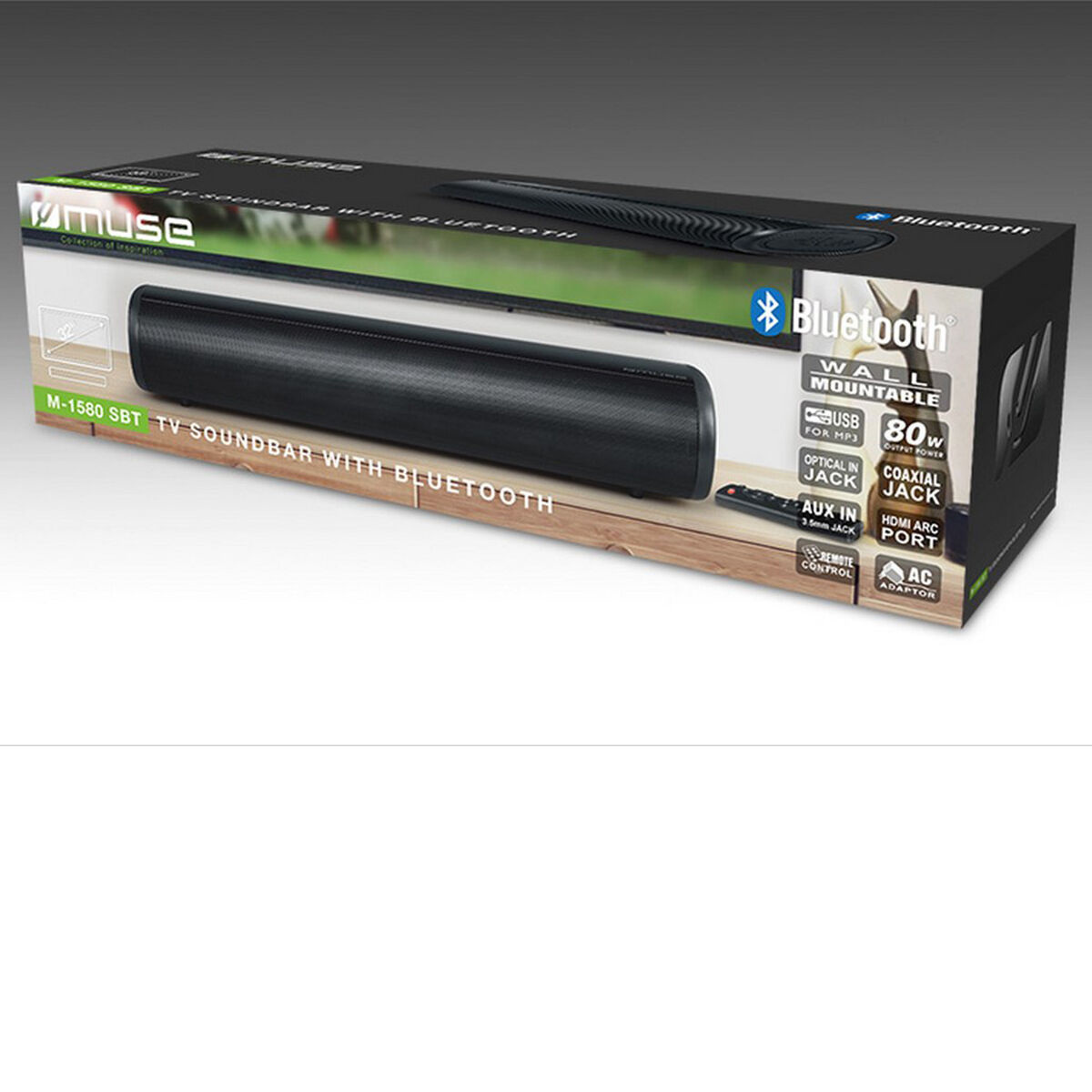 Muse M-1580SBT soundbar voor. Hierdoor is deze soundbar dé oplossing in elk interieur. Dankzij de optische aansluiting kunt u genieten van digitale geluidskwaliteit, waardoor het geluid van de TV sterk verbeterd zal worden. Bovendien kan via bluetooth muziek van uw telefoon en tablet op de Muse M-1580SBT soundbar afgespeeld worden. Verder biedt deze tv-speaker de mogelijkheid om via de AUX-In-, Coax- en HDMI ARC-aansluitingen diverse andere apparaten aan te sluiten. Dankzij de meegeleverde afstandsbediening is deze soundbar vanuit de luie stoel te bedienen.