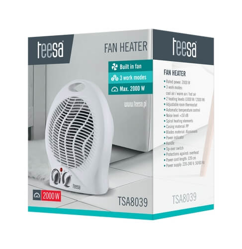 De compacte TSA8039 is een zeer handige lucht-verwarmer van Teesa. Deze ventilatorkachel komt altijd goed van pas voor zowel de koude als warme dagen. Het apparaat werkt op twee vermogensniveaus -1000 W en 2000 W - en heeft ook een ingebouwde thermostaat. Bovendien is de lucht verhitter uitgerust met een automatische temperatuurregeling, zodat u de juiste temperatuur kunt bepalen en behouden. De thermostaat TSA 8039 verwarmt je niet alleen op koude dagen, maar kan ook worden gebruikt voor verkoeling. Daarnaast is ook aan de veiligheid gedacht, door de bescherming tegen oververhitting en een veiligheidsschakelaar in geval van omvallen.