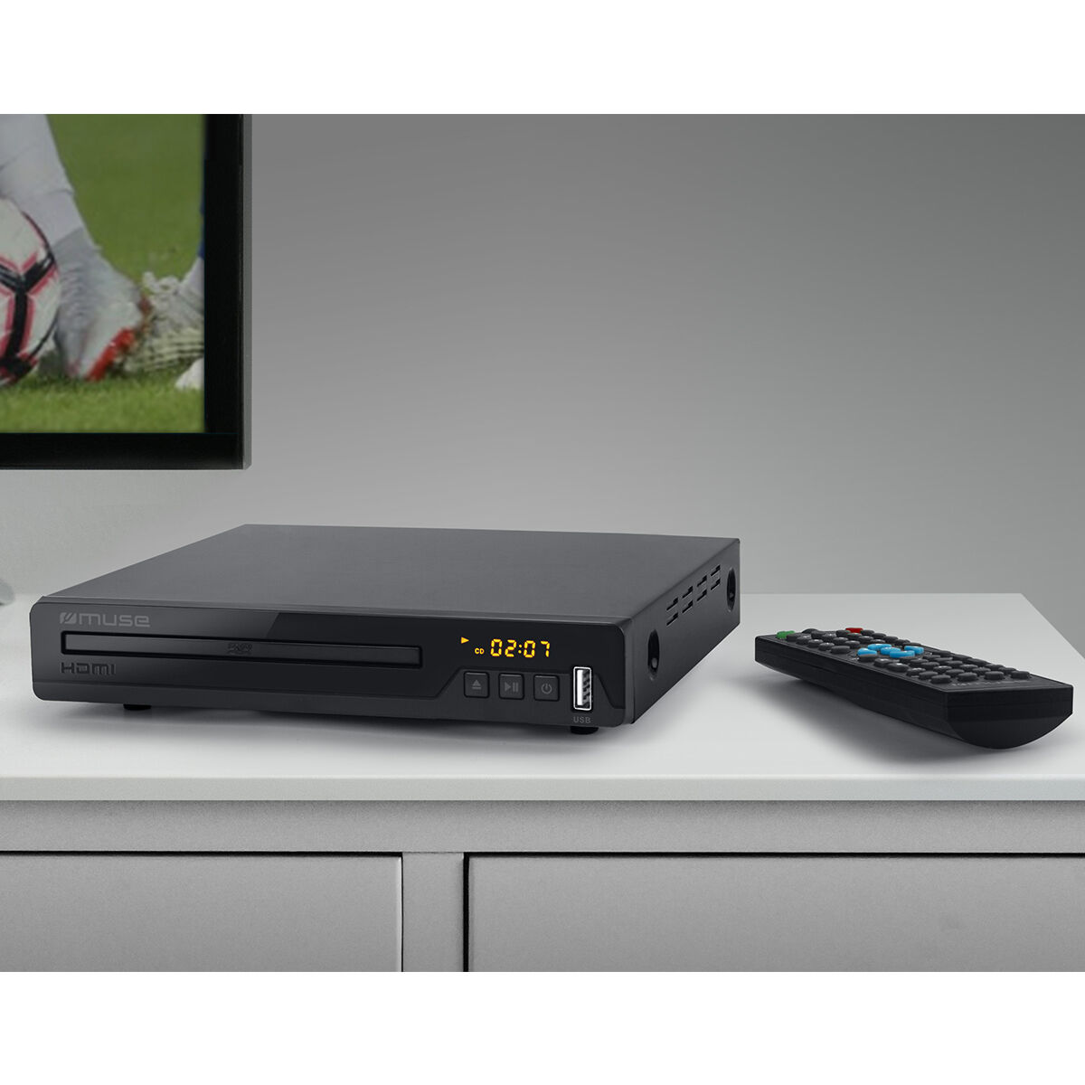Met de Muse M-55DV Full HD DVD-speler kijkt u lekker thuis op de bank naar uw favoriete film, documentaire of concert. Sluit dit compacte apparaat aan op uw TV en eventueel ook op de audioapparatuur en geniet weer van uw DVD’s. Naar muziek luisteren? Dat kan uiteraard ook; CD’s of uw muziek vanaf USB afspelen op de Muse M-55DV is geen probleem. De menubesturing en ondertiteling is aan te passen naar de gewenste taal. De DVD-speler heeft een RCA- en een HDMI-uitgang, zodat u verzekerd bent van haarscherp beeld. Bij dit apparaat wordt een afstandsbediening geleverd; u kunt de DVD-speler dus gemakkelijk vanaf de bank bedienen.